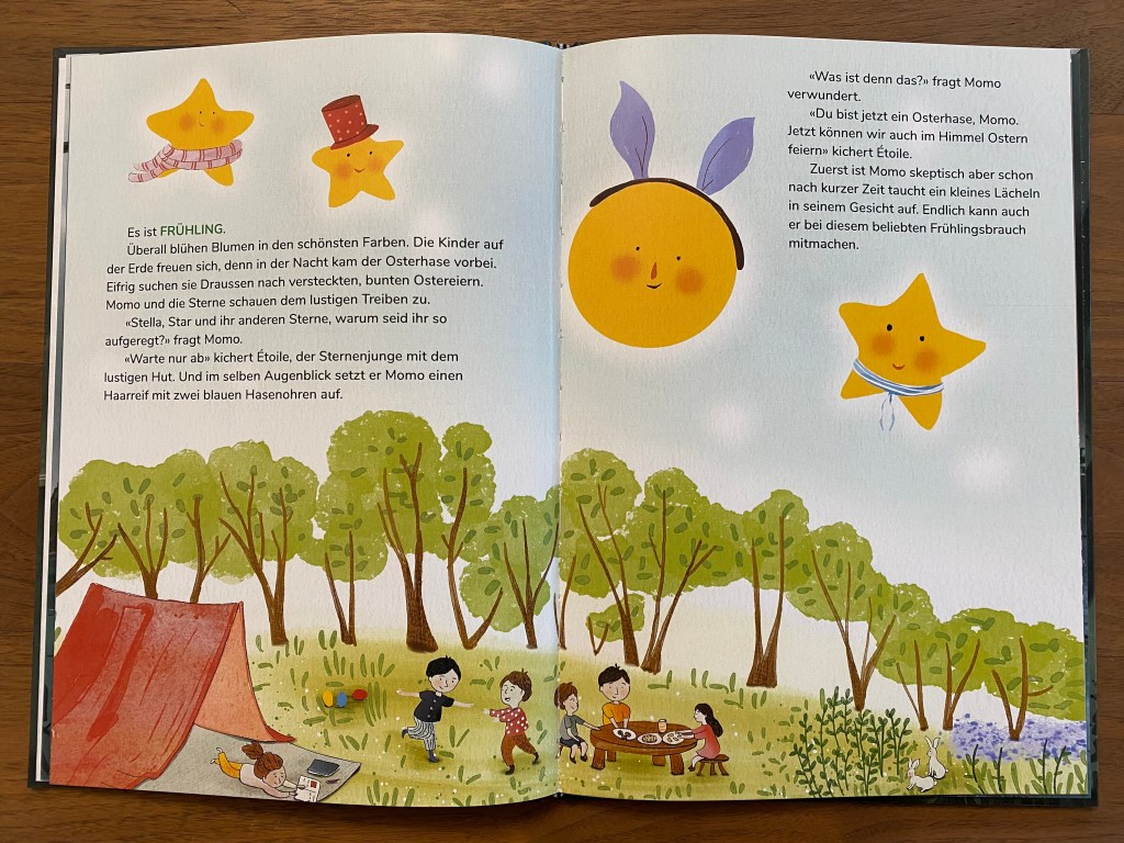Jeden Abend betrachtet Momo der Mond zusammen mit seinen Freunden den Sternen das lustige Treiben der Menschen auf der Erde. Sie haben dabei viel Spass. Eines Tages ist Momo nicht mehr so glücklich. Er möchte gerne bei den Festen und Bräuchen der Menschen dabei sein. Er denkt, dass er nicht mehr so wichtig für die Menschen ist. Daraufhin überlegen sich die Sterne allerlei lustige Dinge, um den Mond aufzuheitern. Momo der Mond ist ein Buch über Freundschaft, den Weg zum Glück, die vier Jahreszeiten, Feste und Bräuche und, dass es gar nicht viel braucht um glücklich zu sein.